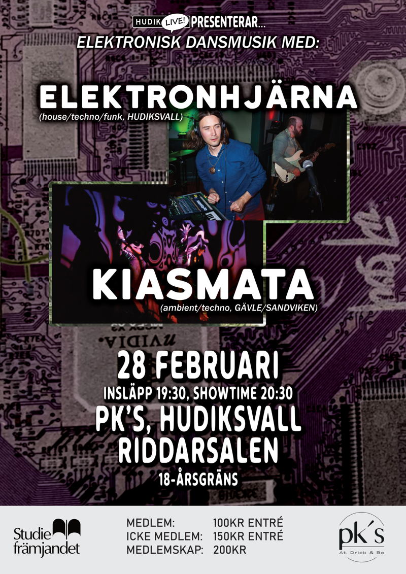 Hudik Live inleder 2026 med elektronisk dansmusik! Den omtalade hudikduon Elektronhjärna står på scen för första gången sedan 2024 och därtill spelar nystartade audiovisuella Kiasmata från Gävle/Sandviken. Det kommer att bjudas på svävande ambient, stenhård techno och funkig house i ett dansparty som sent ska glömmas.